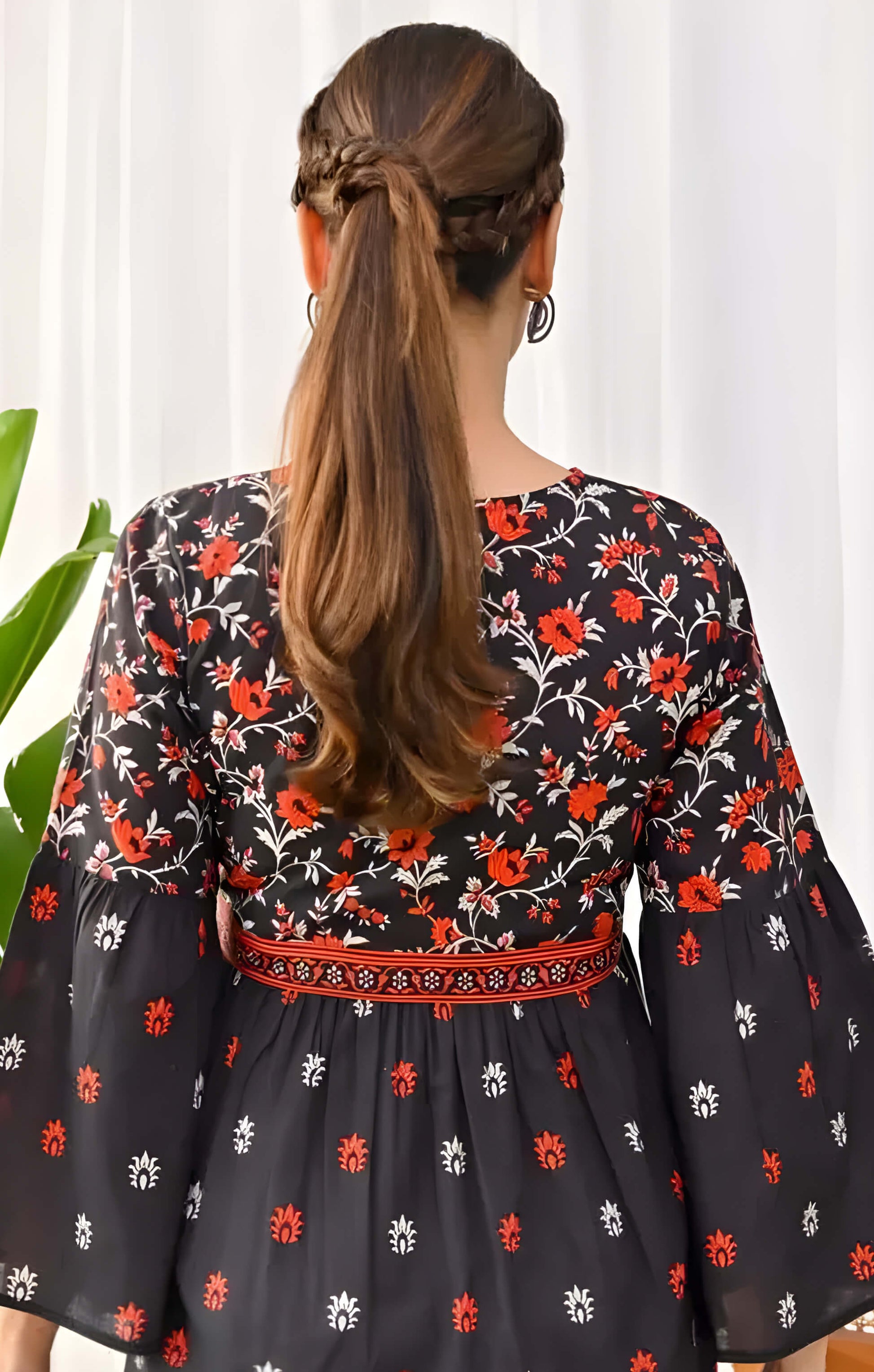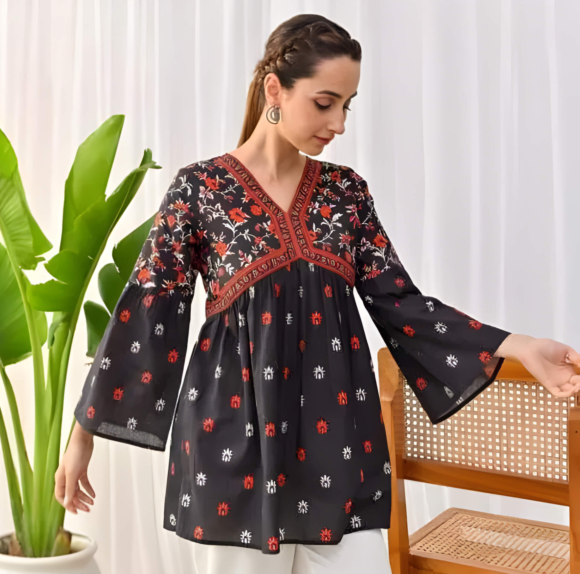 Short kurtis me yeh design sabse alag hai. Black par red flowers ka pattern bahut attractive hai.